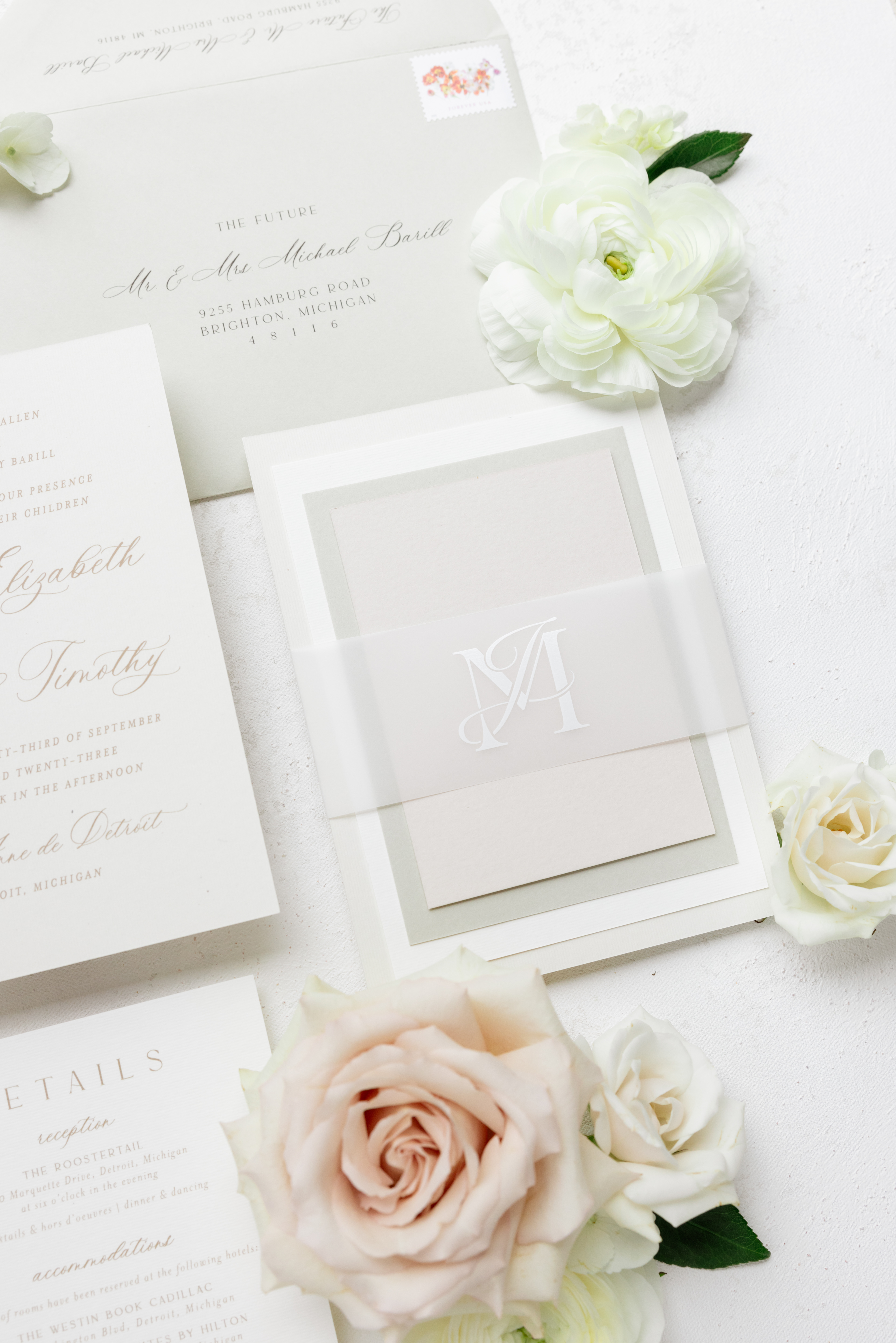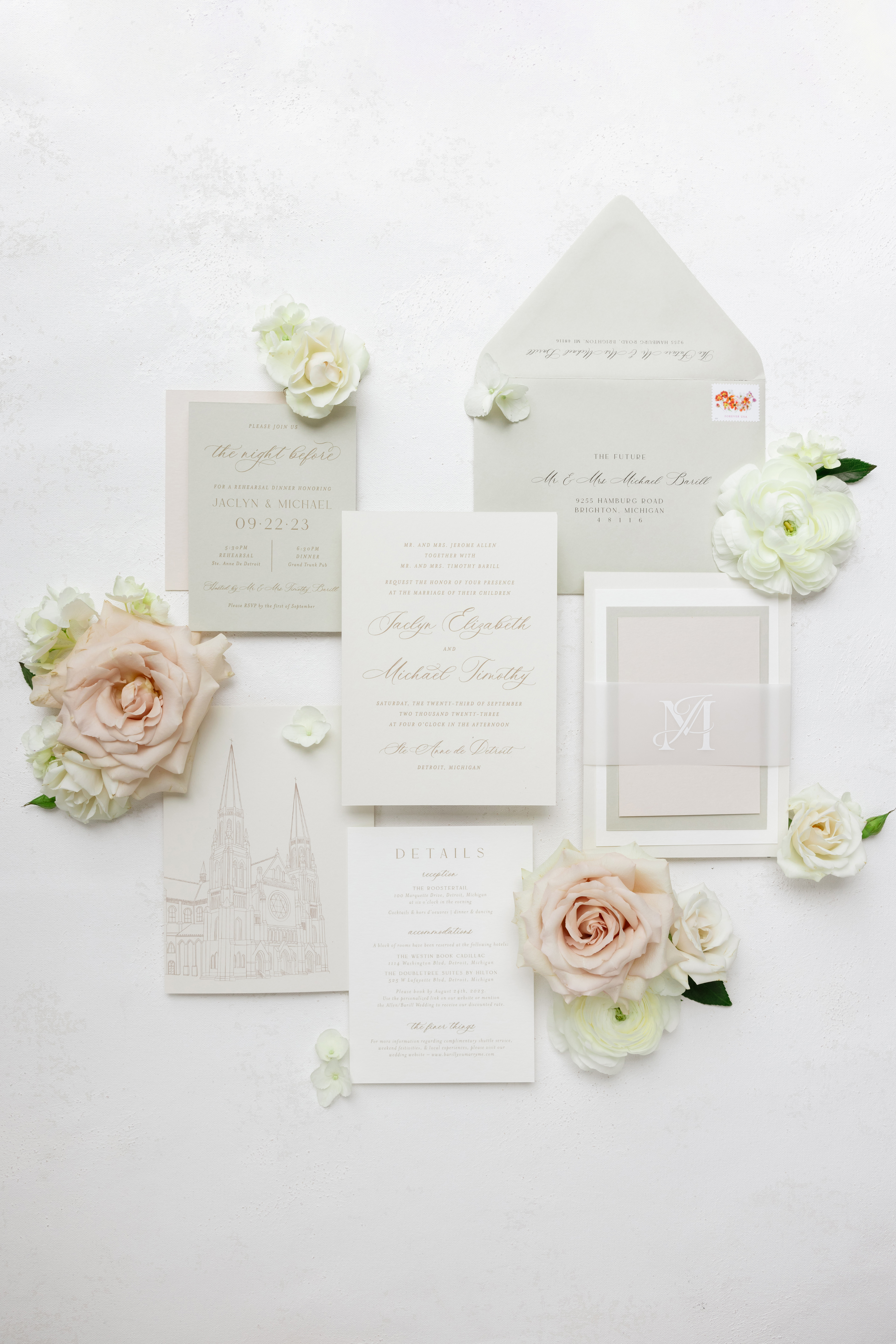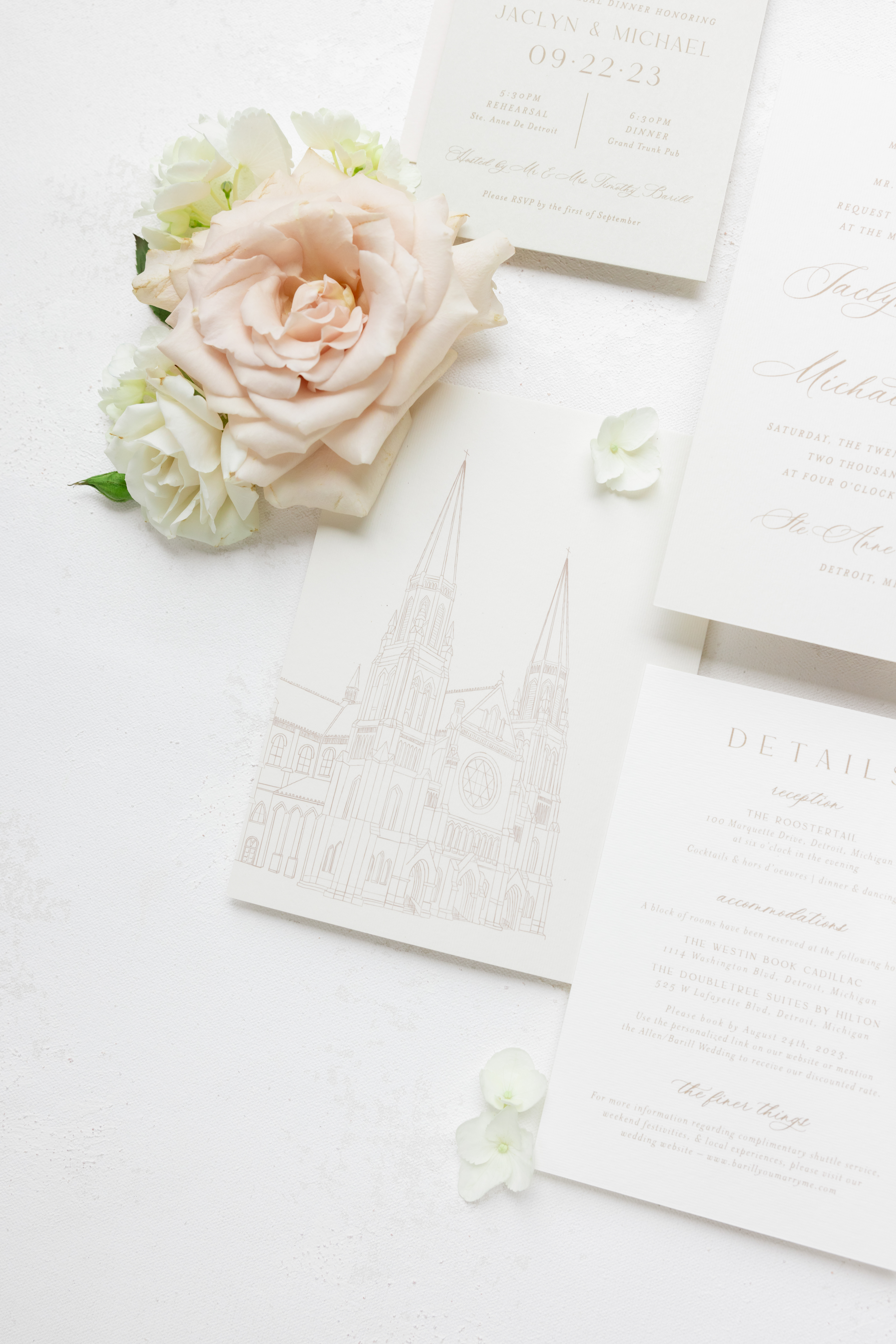 Airy, neutral, and classic– The Bride & Groom wanted a timeless neutral design for their wedding stationery to create a cohesive vibe throughout their big day. With the ceremony at a historical Basilica and their reception at a modern venue along the Detroit River, we created a airy, classic suite to set the tone for the day combining the historic and modern characteristics from each space.